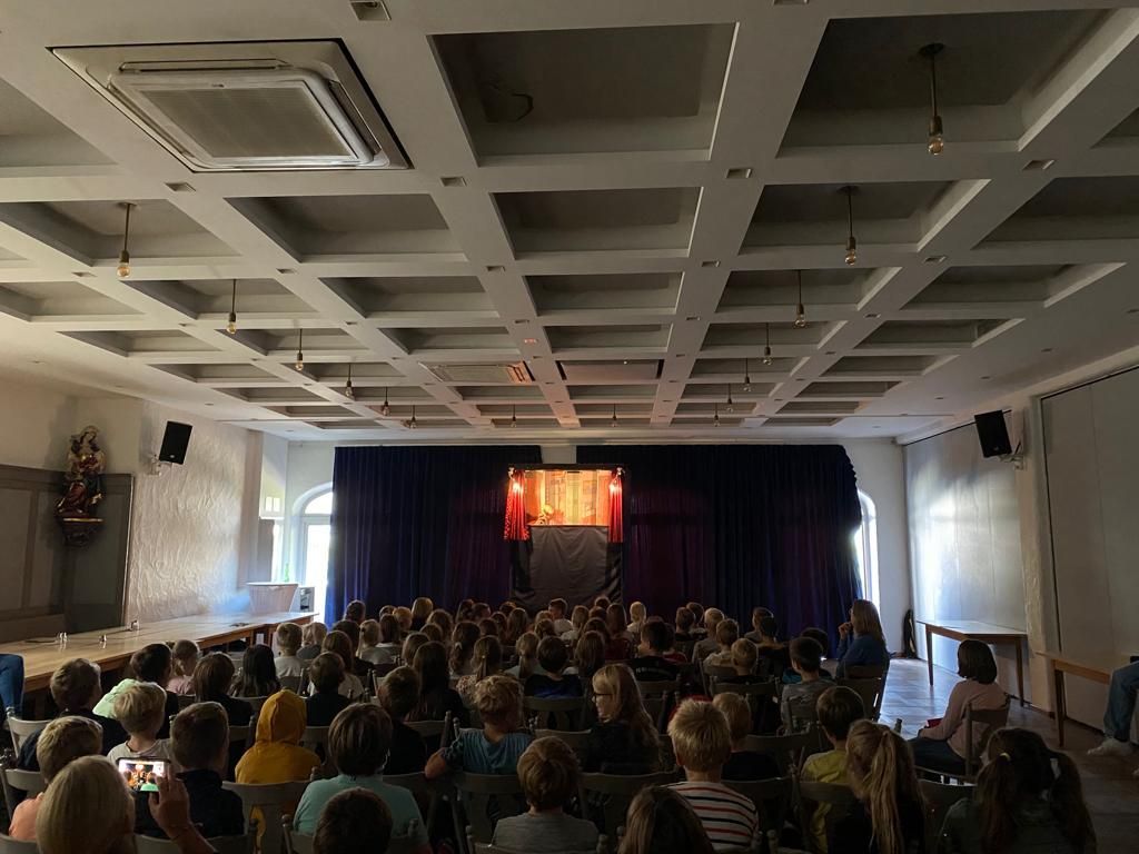 Am 14.12.23 durften alle Schüler und Schülerinnen mit allen Sinnen das Theaterstück „ Die Kartoffelsuppe“ genießen. Es wurde geschnippelt, gekocht, unterhalten und gesungen. Obendrein wurden die Kinder über gesunde Ernährung aufgeklärt. Mittendrin fiel Herrn Gerhard, dem Koch, plötzlich die Geschichte seiner Mutter Kathi ein, die auf dem Land aufwuchs und dort ein Schweinchen großzog. Die Schüler und Schülerinnen hörten begeistert zu. Am Ende des Stückes kam der krönende Abschluss. An einer weißen, fein eingedeckten Tafel, verzehrten die Kinder die leckere Kartoffelsuppe. Eine genussvolle, informative und spannende Angelegenheit. Großer Dank gilt dem Team des Theaters und den fleißigen Helfern vom Bauhof, die den Pfarrsaal zu einer Bühne, einem Zuschauerraum und einem edlen Esszimmer umwandelten. (Angelika Aschbacher)